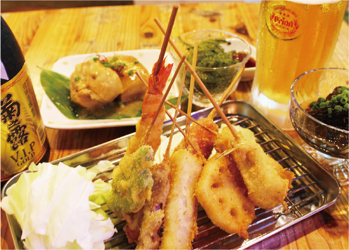 沖縄のお肉・野菜・魚を使ってカラッと揚げた串カツ屋さんです。