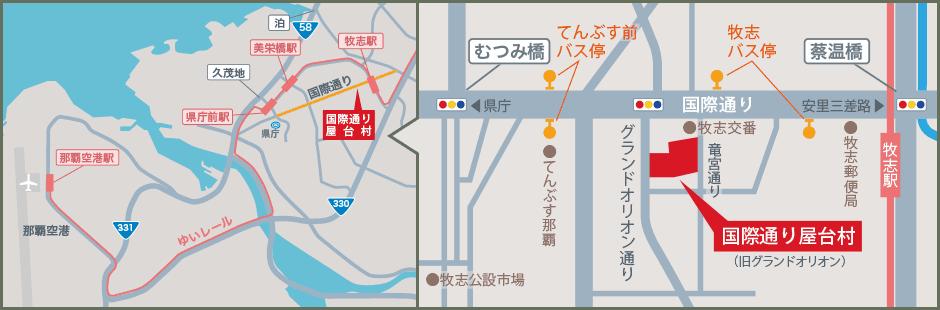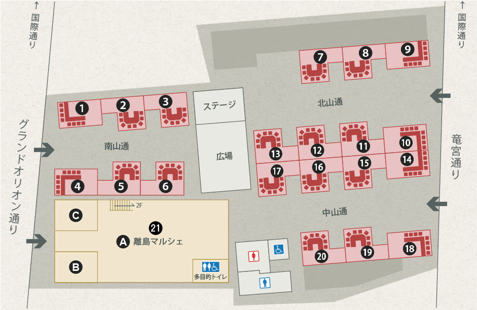 ・ゆいレール「那覇空港駅」から 「牧志駅」まで約16分 ・ゆいレール「牧志駅」から徒歩4分 ・各バス会社「てんぶす前」「牧志」の バス停から徒歩3分 ・お車でお越しの際は、近隣のパーキングをご利用ください。 ・住所:沖縄県那覇市牧志3-11-16,17 【南山通り】①きくちゃん ②築地 男前鮓 ③味ノ坊 ④チーム ヤシの木 ⑤きんぱち ⑥琉海 ㉑しまぁしまぁ 【北山通り】⑦ゑーさいん ⑧チキンバロン ⑨豚の虜 ⑩ゆうなみ ⑪鷠(フィッシュバード) ⑫牧志琉 ⑬島酒と肴 【中山通り】⑭村咲 ⑮ちょこっと寿司 ⑯屋台村じゅんちゃん ⑰シーサードラゴン ⑱沖らく ⑲ららら ⑳キングオブチキン 屋台一覧へ アクセス 国際通り屋台村 お客様へのお願い・屋台村内での大声を出す、過剰な拍手など近隣への騒音となるような行為はやめてください。・屋台村付近で車や歩行者の通行の妨げになるような行為や迷惑となるような行為、近隣の敷地への立ち入りなどはやめてください。